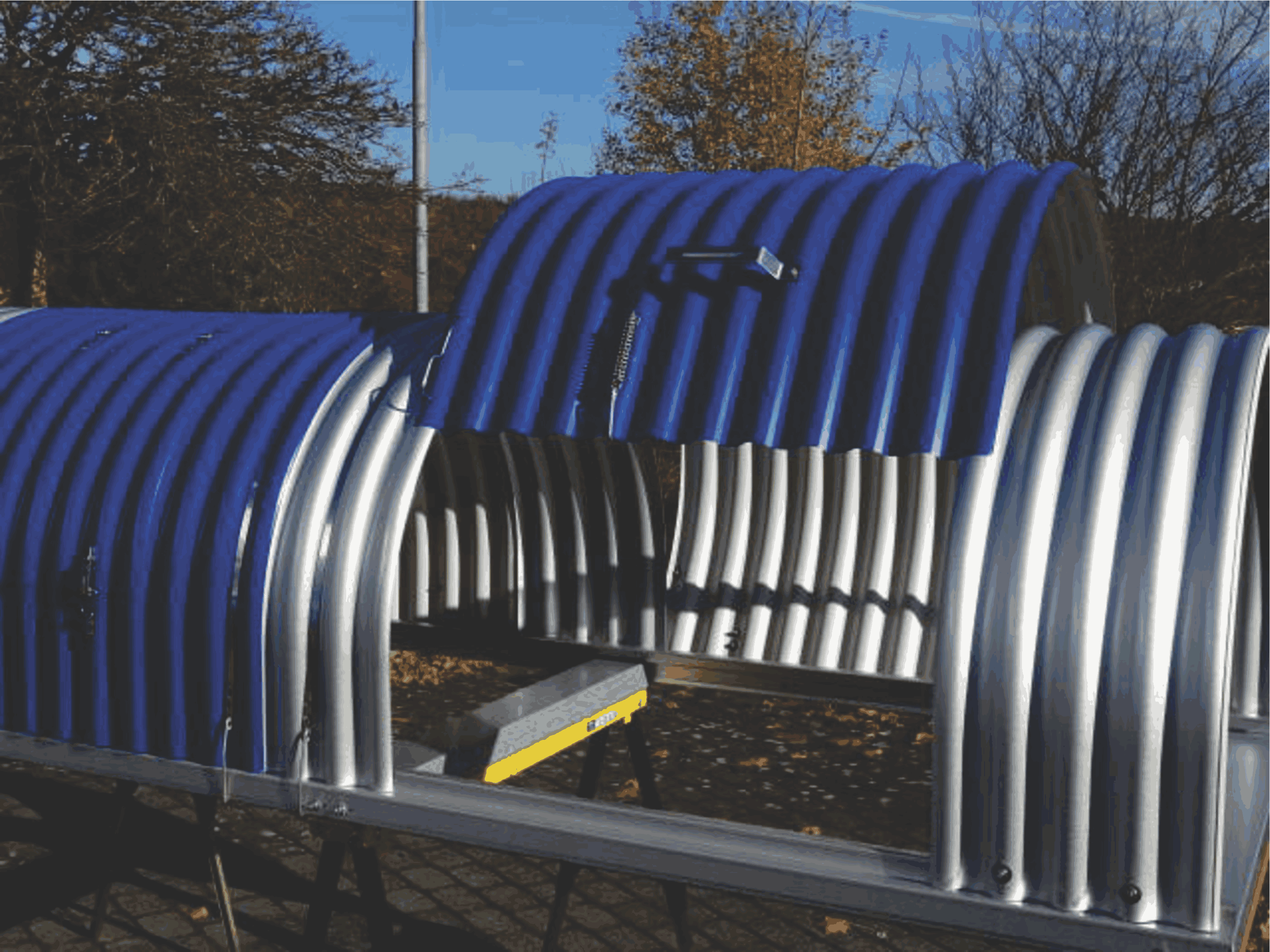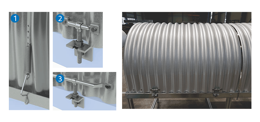 A Cobertura de Correia Metálica Removível modular possui 4 pinos de dobradiça galvanizados e 4 pequenos suportes galvanizados que garantem uma fixação rápida e segura. É facilmente removida, retirando-se os pinos, onde todo o módulo pode ser retirado com total segurança. Como medida extra os pinos podem ser travados com cadeados, sendo apenas retirados por pessoal autorizado.