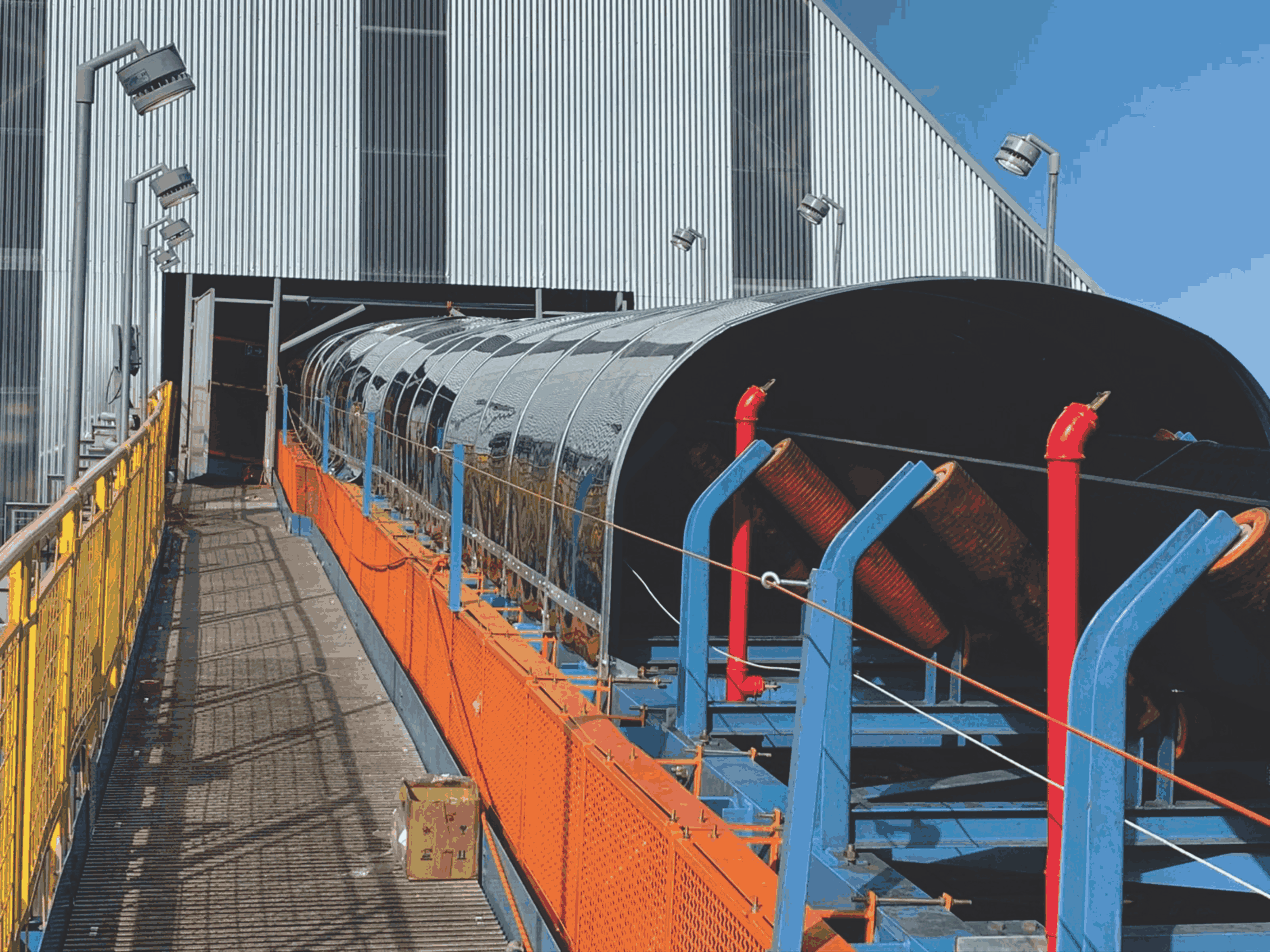 A Cobertura de Correia Corrugada é dimensionada para proteger o transportador e o material de uma maneira eficiente e segura. É resistente a impactos externos ou mesmo do material transportado, e conta com proteção dos raios UVA e UVB. Seu projeto permite acesso a ambos os lados do transportador, permitindo serviços no equipamento, com total segurança.