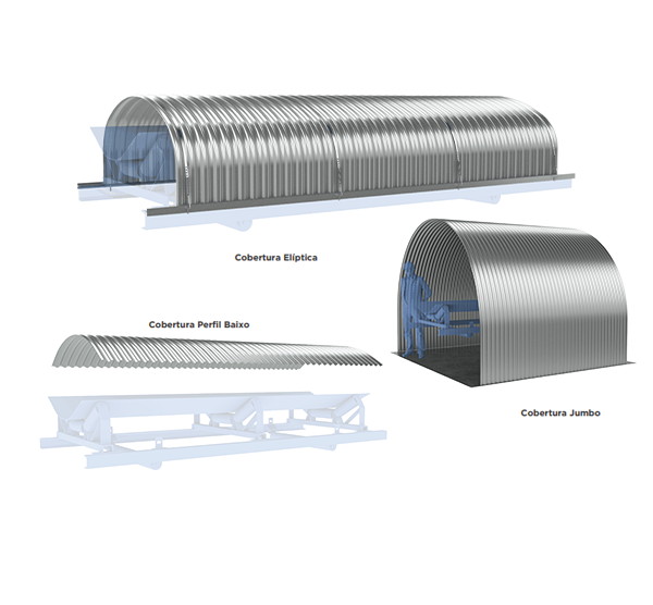 As Coberturas de Correias Metálicas Especiais são projetadas para atender à necessidades específas de cada aplicação. A Cobertura Jumbo são maiores para proteger toda as esturura do transportador, permitindo acesso do operador sem a necessidade de retirar. A Cobertura Elíptica com seu design plano, é ideal para correias muito largas e altas, como as dos Terminais Portuários. E a Cobertura de Perfil Baixo indicada para aplicações mais leves, onde os requisitos para a proteção dos transportadores permitem uma cobertura mais simples e com menos área de atuação. Todos os projetos são adpatados à cada aplicação específica das plantas.