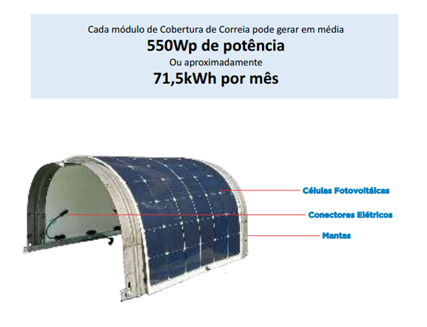 Cobertura de Correia FLOWS CF-TEC OPV alia o que há de mais moderno e seguro para cobertura de correia com a mais avançada tecnologia em termos de materiais geradores de energia. Através dos células fotovoltáicas é produzida energia solar limpa e sustentável a partir das Coberturas de Correia. Essa energia pode ser armazenada ou utilizada em aplicações como iluminação, tomadas, etc.