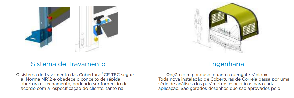 Cobertura de Correia Metálica NR12 é especialmente destinada àquelas aplicações onde há riscos de grandes impactos externos no material e transportador. Produzida em aço carbono sua espessura pode variar de acordo com as necessidades de cada cliente. Não há necessidade de retirá-la para efetuar a manutenção dos componentes do transportador pois é dimensionada para estar acima do ponto de manutenção, e assim permitindo o total acesso aos componentes com total facilidade. Segurança máxima para os funcionários e proteção extrema para os componentes do transportador de correia e material transportado.